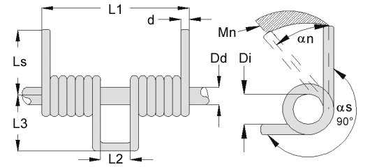 Kettős torziós rugóink 2 láb helyzetben kaphatók, s = 0 fok és s = 90 fok.